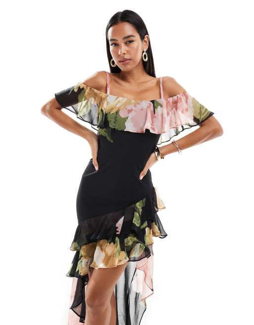 Product Name: Asymmetric hem retro flower print off the shoulder dress top